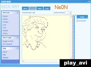 Cool ASCII is a powerful tool for ASCII Art generation. You can make ASCII Art Words, ASCII Art Photos easily by using Cool ASCII. Cool ASCII can also convert an image to an HTML file with color-coded characters. The files can make the website more beautiful and livelier. Also, you can make your individual ASCII Art Signatures by Cool ASCII. Use them in e-mails, documents or even in the forums on the web will be a good idea.